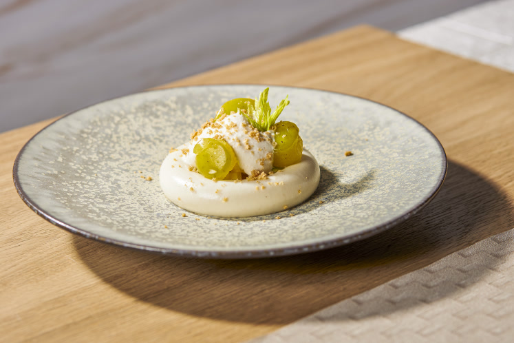 Panna cotta met hangop, appelinfusie, salade, foam en crumble