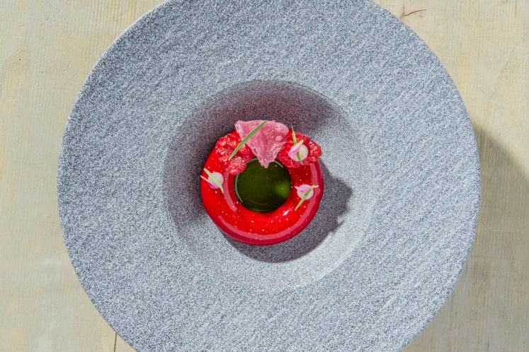 - Dresseer de ontdooide panna cotta ringen op de borden en spuit de dragonsiroop in het midden.
