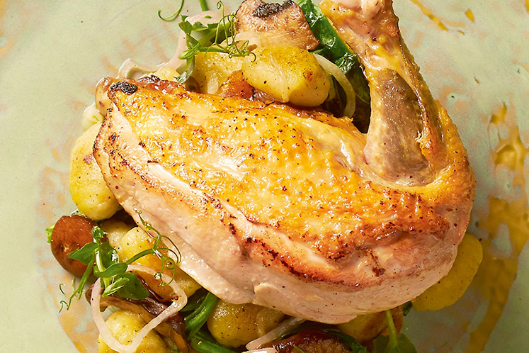 - Plaats de gnocchi met spinazie op het bord en leg hierop de parelhoen en eventueel wat gebakken paddenstoelen.