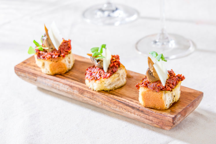 Crostini getopt met zontomaat, pecorino en champingons.