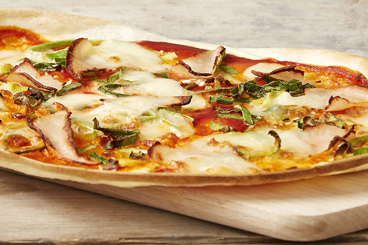 Deze superplatte pizza is gebakken met deeg voor flammkuchen.