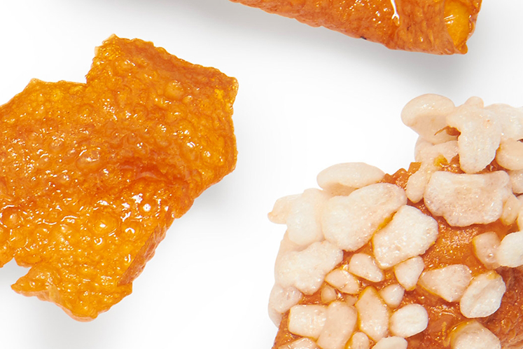 - Giet de pompoenpuree uit op siliconen droogmatjes, bestrooi met de rauwe kroepoek en droog circa 2 uur op 65°C. Frituur op 180C? in olie.
