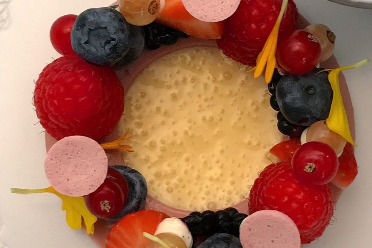 - Garnering: Prestige aardbeien, blauwe, rode en witten bessen, frambozen, bramen en eetbare bloemen.