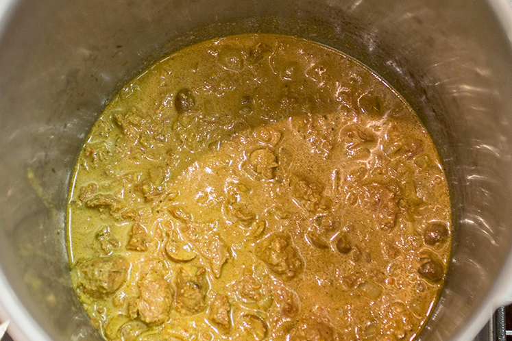 - Voeg een bakje Kumar’s rendang toe en een kilo gesneden ui. Zet nog 10 minuten onder druk