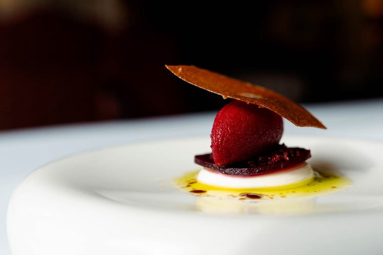 - Het romige/zure van de crème cru past geweldig bij de Tomasu Soy Sauce en de rode biet. Heerlijke vega starter voor het begin van het kerstmenu.