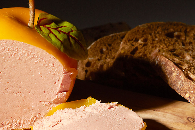 - Haal de paté uit de vorm, steek een satéprikker in de bovenkant en dompel onder in de warme gelei.