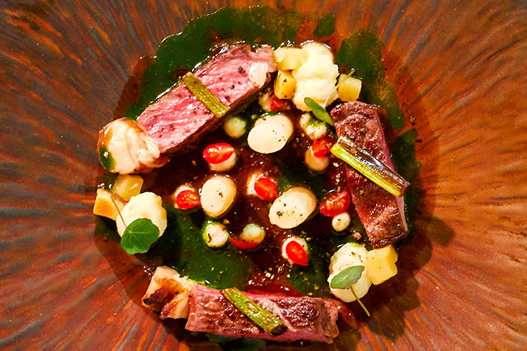 Runderentrecote met pastinaak, morillejus en kruidencoulis