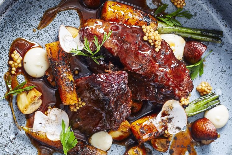 Kalfswang met mosterd, bospeen en aioli