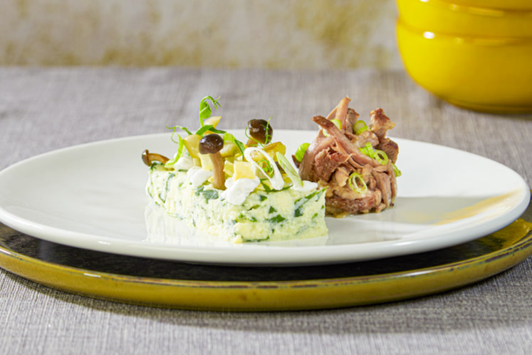 Dit recept bestaat uit een stamppot van raapstelen, lamschouder en Pérail Papillon (schapenkaas).
