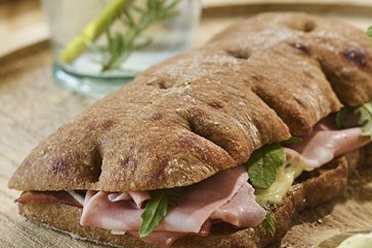 Schiacciata Romana multigrain pre-sliced, Mortadella e Tartufo met truffelmayonaise, mortadella, ontpitte groene olijven en rucola.Benodigdheden