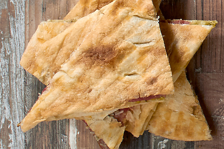 - Snijd de sandwich op de gewenste maat en verwarm hem kort in een grill.
