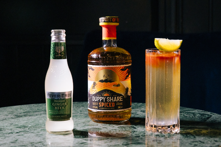 - Vul een highball-glas met ijs en schenk de Duppy Share Spiced, suikersiroop en limoensap erin.