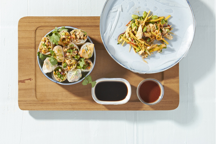 Springrolls met gerookte makreel, glasnoedels en lente-ui