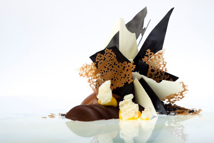 Deze symfonie van chocolade bestaat uit 7 onderdelen: Tanzania ganache, chocolademousse, passiefruit/mangocremeux, chocoladesorbet, witte chocoladesaus, suikergallet en een witte chocolade bros.Benodigdheden