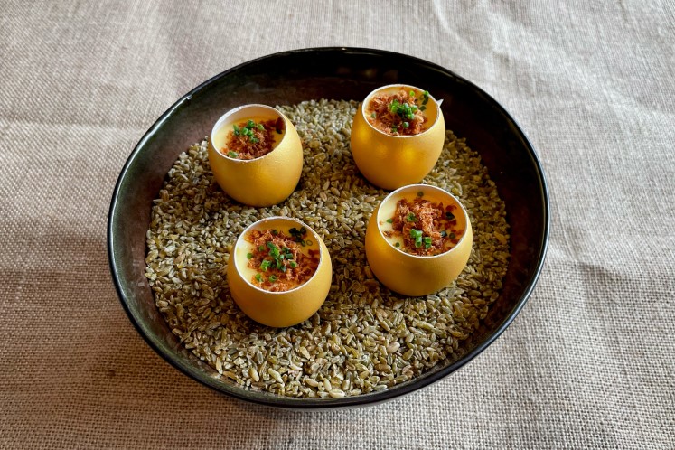 Fijne tartaar van asperge geserveerd in een eierdopje, afgewerkt met een gerookte hollandaisesaus en een crumble van zalm teriyaki.