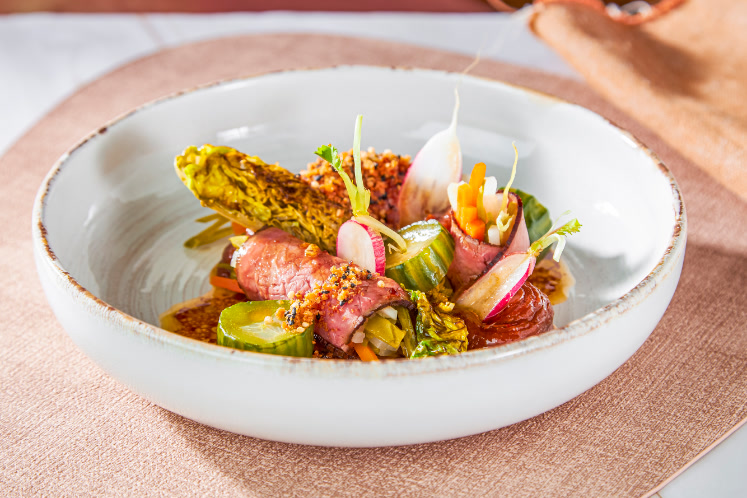 Sous-vide gegaarde rundermuis, gevuld met zoetzure groenten, geserveerd met gado gado-crème en Koreaanse crumble. Circa kostprijs per persoon: €2,42.Rundermuis, bekend van carpaccio en rosbief, is mals en levert veel couverts op. Hier wordt het sous-vide gegaard en gevuld met zoetzure groenten. Geserveerd met een gado gado-crème en een Koreaanse crumble.