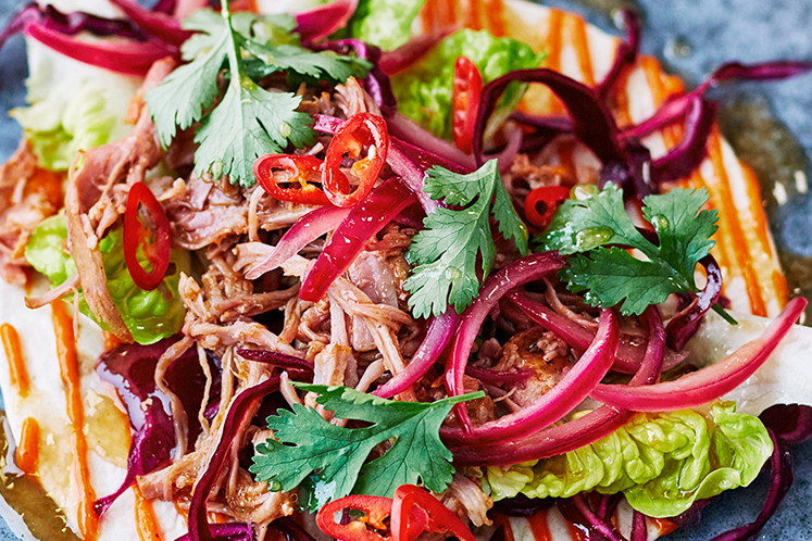 - Verdeel de rode kool, little gem, “pulled pork”, rode uien over de tortilla’s.