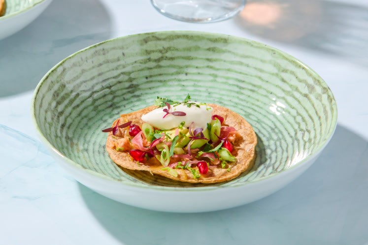 Een heerlijk vegan gerecht bomvol frisse smaken. Tortilla met gesmolten vegan cheddar, getopt met vegan sour cream, vegan tonijn, sexy sauerkraut en granaatappel.Benodigdheden