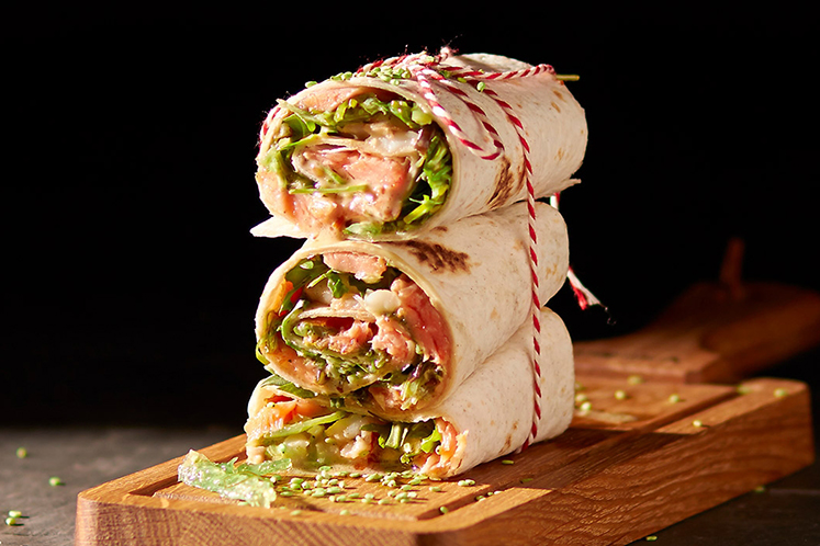 Tunnbröd met warm gerookte zalm, gamba’s, rucola, wakame en een Japanse sesamdressing.Benodigdheden