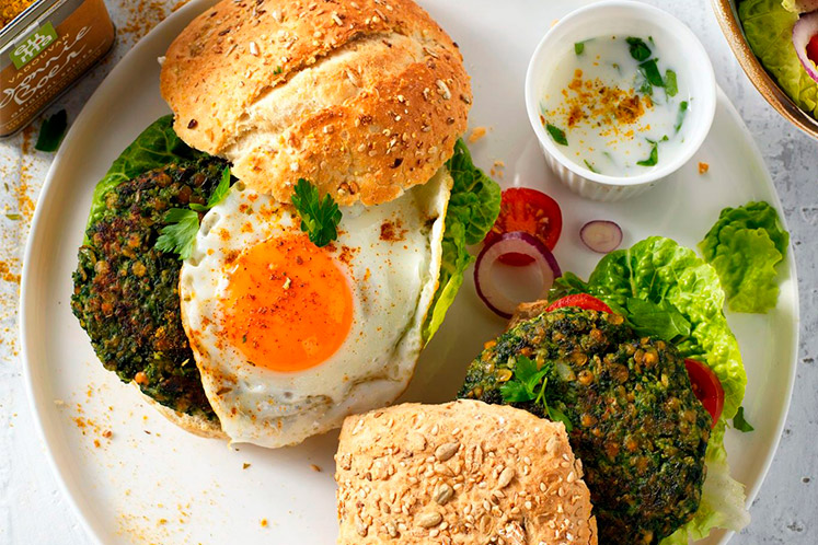 - Meng het restant Vadouvan met peterselie door de yoghurt voor de dressing. Bak zodra de burgers goudbruin zijn de eieren naar wens gaar.