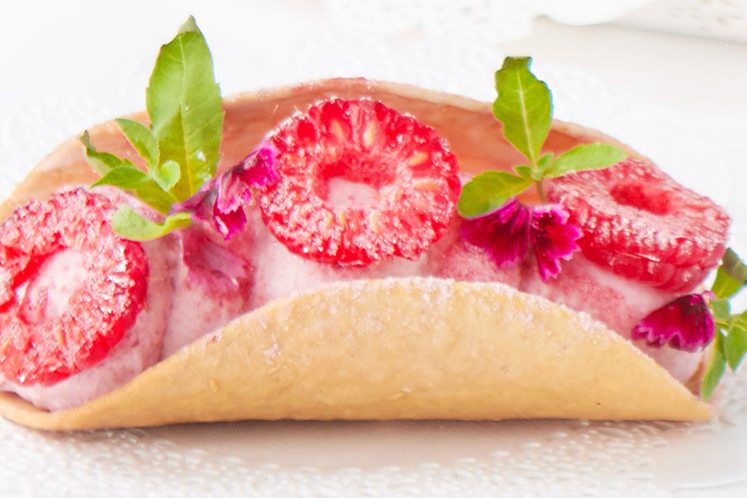 - Vul de taco’s met de frambozenmousse.