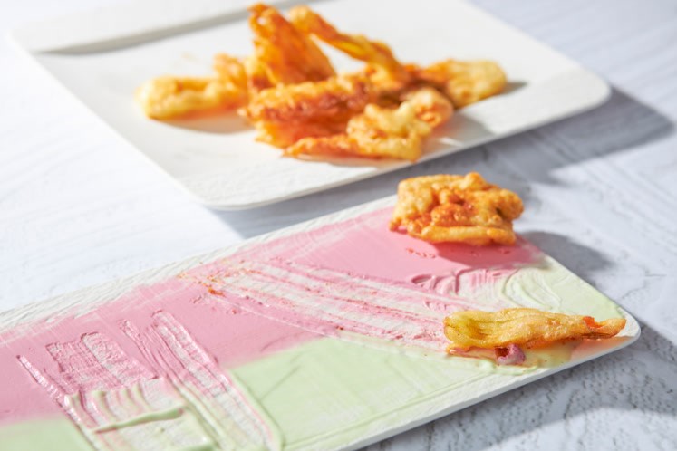 Zucchini Blossoms met karnemelk, biet en basilicum.Courgettebloem in krokant beslag van karnemelk en harissa geserveerd met twee dippers, waarvan één van buffelricotta, mascarpone en rode biet en één van buffelricotta, yoghurt, en kruidenolie.
